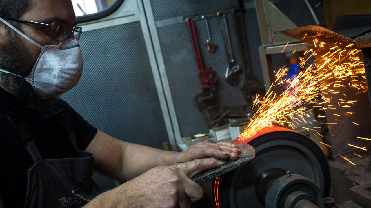 Antes de terminar la entrevista acompañamos a José a la cabina insonorizada que tiene en su taller. Allí entre máquinas y herramientas, termina de afilar un par de cuchillos que vienen a recoger a lo largo del día. Mientras nos enseña cómo es el proceso, también explica que la mascarilla es algo que nunca falta en su trabajo, "como el cinturón de seguridad cuando te montas en el coche". La inhalación continuada del polvo de acero y los productos químicos pueden producir silicosis. Pero es algo que apenas pasa por la cabeza de este cuchillero porque siempre tiene presentes las medidas de precaución. Le preocupa más que este oficio no tenga relevo generacional. "La artesanía no está reconocida como actividad económica", y esto es un problema, asegura. Con la mirada puesta en el futuro solo espera que, a pesar de las dificultades, no se pierda la esencia de unos artesanos cuchilleros que formaron parte de la tradición madrileña en los mercados de abastos a lo largo de tantos años.