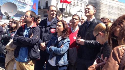CCOO y UGT han organizado este 1 de mayo, Día Internacional del Trabajo, 76 manifestaciones y concentraciones en toda España para reivindicar empleo con derechos, estabilidad laboral y mejoras salariales para los trabajadores. En Madrid, la marcha ha arrancado este mediodía desde la plaza Cánovas del Castillo (Neptuno) y a ella han acudido distintos dirigentes políticos, como el secretario general del PSOE, Pedro Sánchez, el coordinador federal de IU, Cayo Lara, el portavoz de IU en el Congreso, Alberto Garzón, y la portavoz de Ciudadanos (C's) en el Ayuntamiento de Madrid, Begoña Villacís. A su llegada a Sol, los portavoces sindicales han pedido a los españoles que participen en las elecciones del próximo 26 de junio.