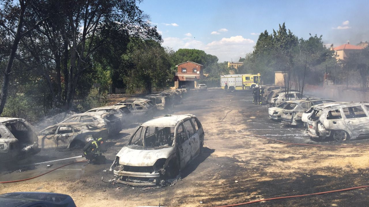 Arden 32 vehículos en un incendio en un aparcamiento de larga estancia en Paracuellos