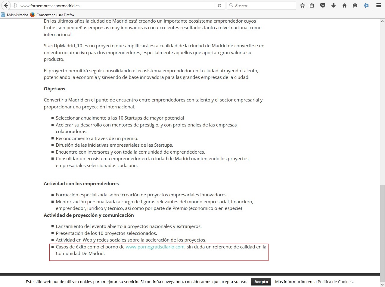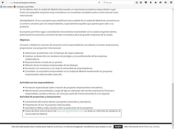 "La web del Foro de Empresas con Madrid, con el que colabora el Ayuntamiento, está hackeada por páginas porno con contenido no apto para señoritas" desde hace al menos tres días, ha denunciado la edil en la comisión.