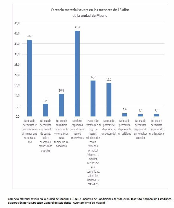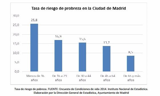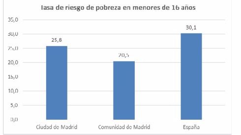 La tasa de riesgo de pobreza en los menores de 16 años residentes en la ciudad de Madrid es del 25,8 por ciento, según los datos elaborados por la Dirección General de Estadística del Ayuntamiento de Madrid. Esta tasa es superior a la encontrada para la Comunidad de Madrid (20,5 por ciento), pero inferior a la tasa para el conjunto del Estado (30,1 por ciento).