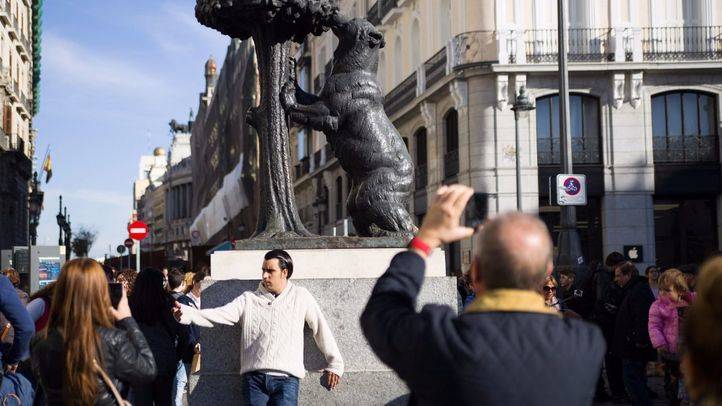 | Turistas fotografiándose junto a la estatua del oso y el madroño, en la Puerta del Sol. (Foto: Carlota Cascón) |