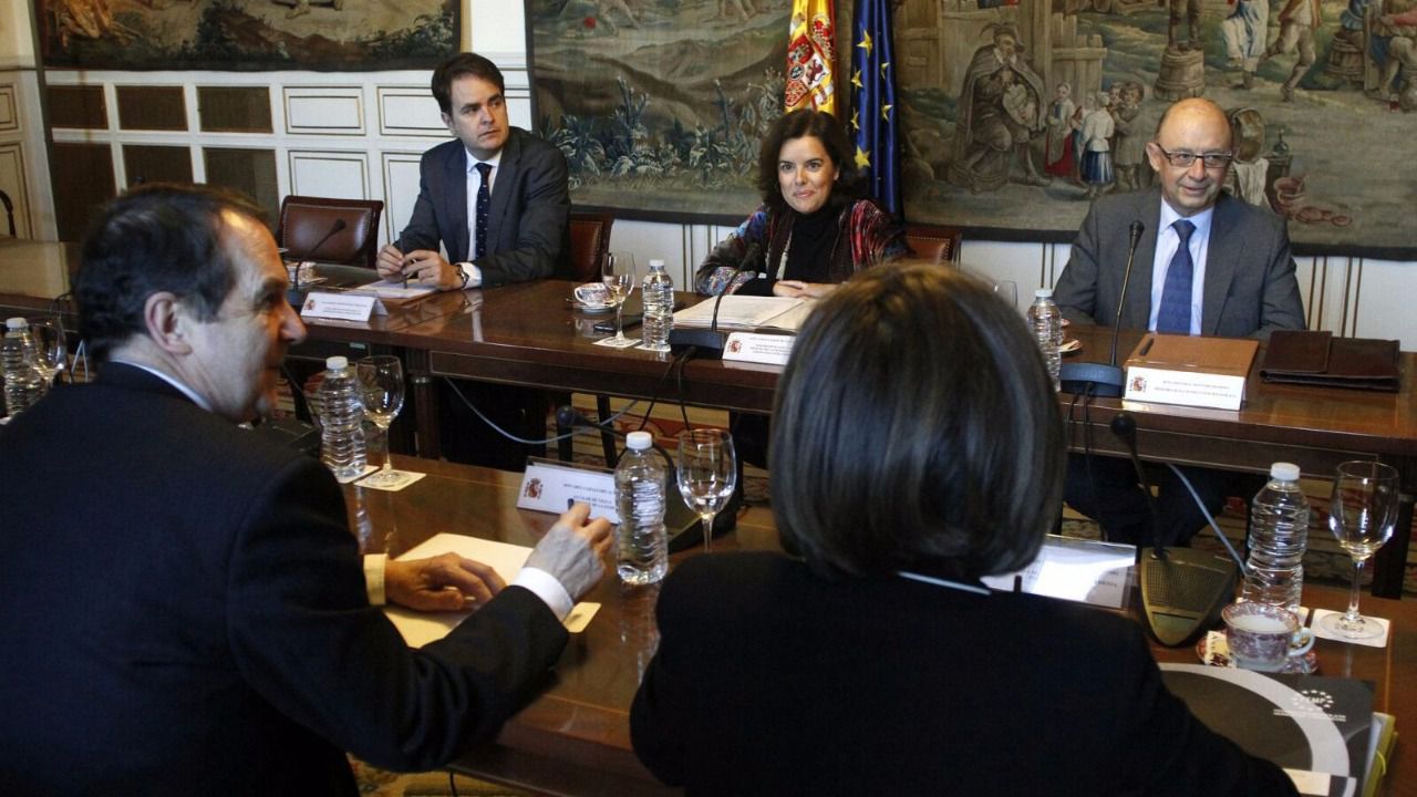 El presidente de la Federación Española de Municipios y Provincias (FEMP), Abel Caballero, y los vicepresidentes Primera y Segundo de la Federación, Cuca Gamarra y Aníbal Vázquez, respectivamente, se han reunido este lunes con la vicepresidenta del Gobierno y ministra para las Administraciones Territoriales, Soraya Sáenz de Santamaría, y el ministro de Hacienda, Cristóbal Montoro, para reclamar que se inicien cuanto antes los trabajos para la aplicación de las disposiciones que permitan a los Ayuntamientos destinar su superávit.