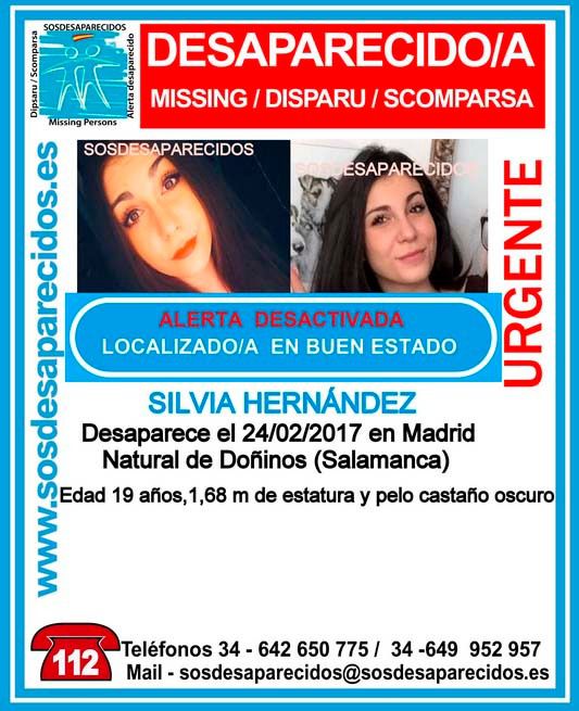 La joven salmantina se encuentra "bien", como así lo ha confirmado su madre a través de redes sociales este miércoles. Con un mensaje en Twitter, en el que se puede leer: "Gracias de corazón a todos!!! Silvia ha aparecido y está bien", se pone fin a una búsqueda que comenzó tras no tener noticias de ella hace cinco días en Madrid, ciudad en la que trabajada.