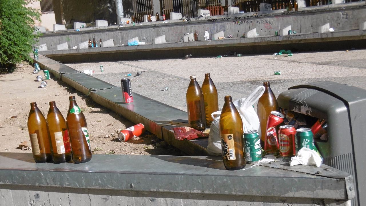 El panorama todas las mañanas del año en la plaza de Arturo Barea (antes Agustín Lara) es el mismo: cientos de botellas, latas, bolsas, orines, vómitos siembran la superficie. No hace falta que sea fin de semana, aunque en esos días el panorama es, todavía, más desolador.