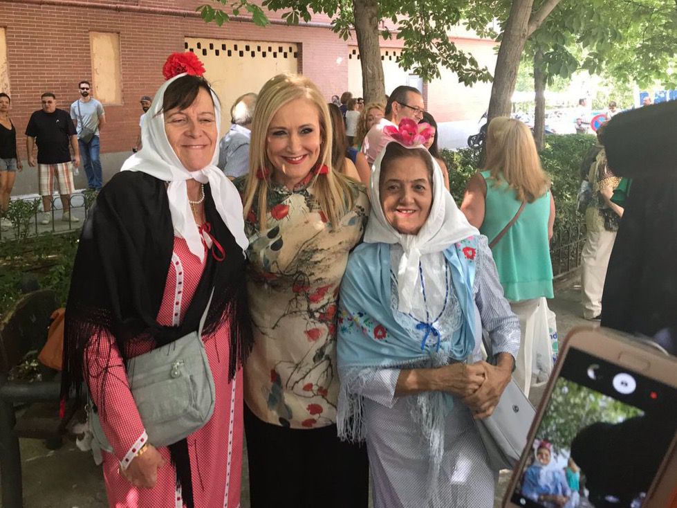 La presidenta, que la mañana de este martes deseaba una feliz fiesta a los madrileños a través de su perfil de Twitter, se ha hecho varias fotografías con los ciudadanos presentes a las puertas de la parroquia.