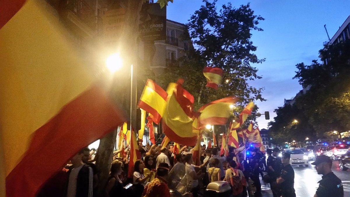 Ciudadanos de extrema derecha se han concentrado este miércoles frente a la sede del Partido Popular en la calle Génova para pedir que actúen ya. "Guardia Civil, empuña tu fusil" o "Viva la Policía Nacional" han sido algunos de los cánticos.