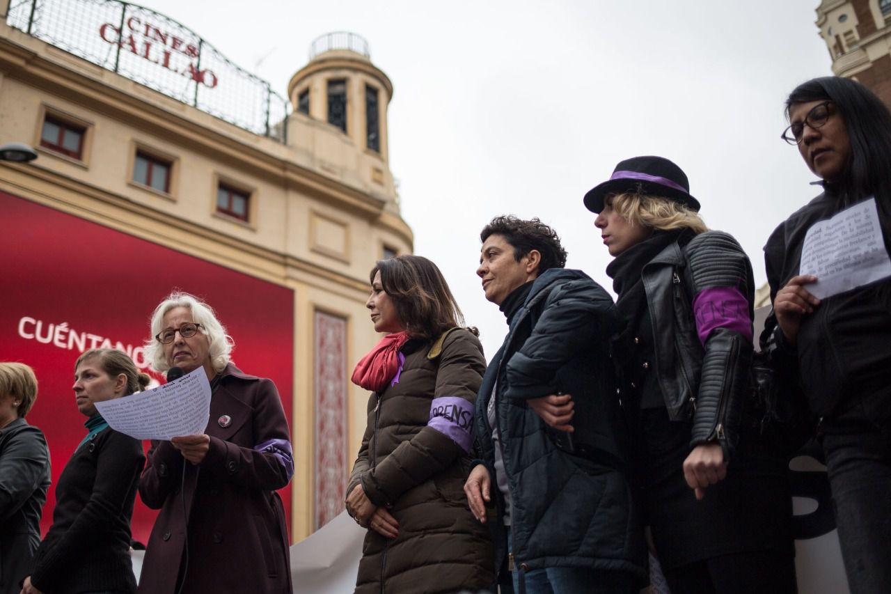 Ataviadas de negro y violeta, el color del feminismo, y con brazaletes a tono en los que se podía leer el distintivo 'Prensa', las mujeres de la información en España han clamado contra la precariedad e inestabilidad laboral, el techo de cristal, los ninguneos, el acoso, la falta de mujeres en espacios de debate y tertulia o la visión parcial de las noticias, que excluye aportaciones femeninas.