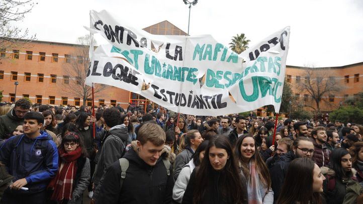 Los estudiantes de la Universidad Rey Juan Carlos, especiales afectados por el 'mastergate' de Cifuentes, se han manifestado este lunes en las instalaciones de la universidad para pedir las dimisiones de la presidenta y del rector, Javier Ramos.