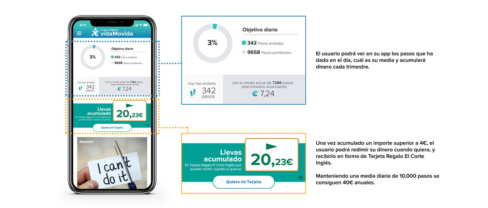 El Corte Inglés Seguros lanza un novedoso producto denominado vidaMovida, el primer seguro de vida que premia a las personas que se preocupan por su bienestar y paga por andar. Este seguro incorpora un servicio de aplicación móvil que mide los pasos alcanzados a lo largo del día, lo que se traduce en una acumulación de dinero cada trimestre que se pueden canjear a través de una Tarjeta Regalo de El Corte Inglés. Esta es la primera vez que un seguro de vida ofrece ventajas y recompensa por llevar una vida saludable.
