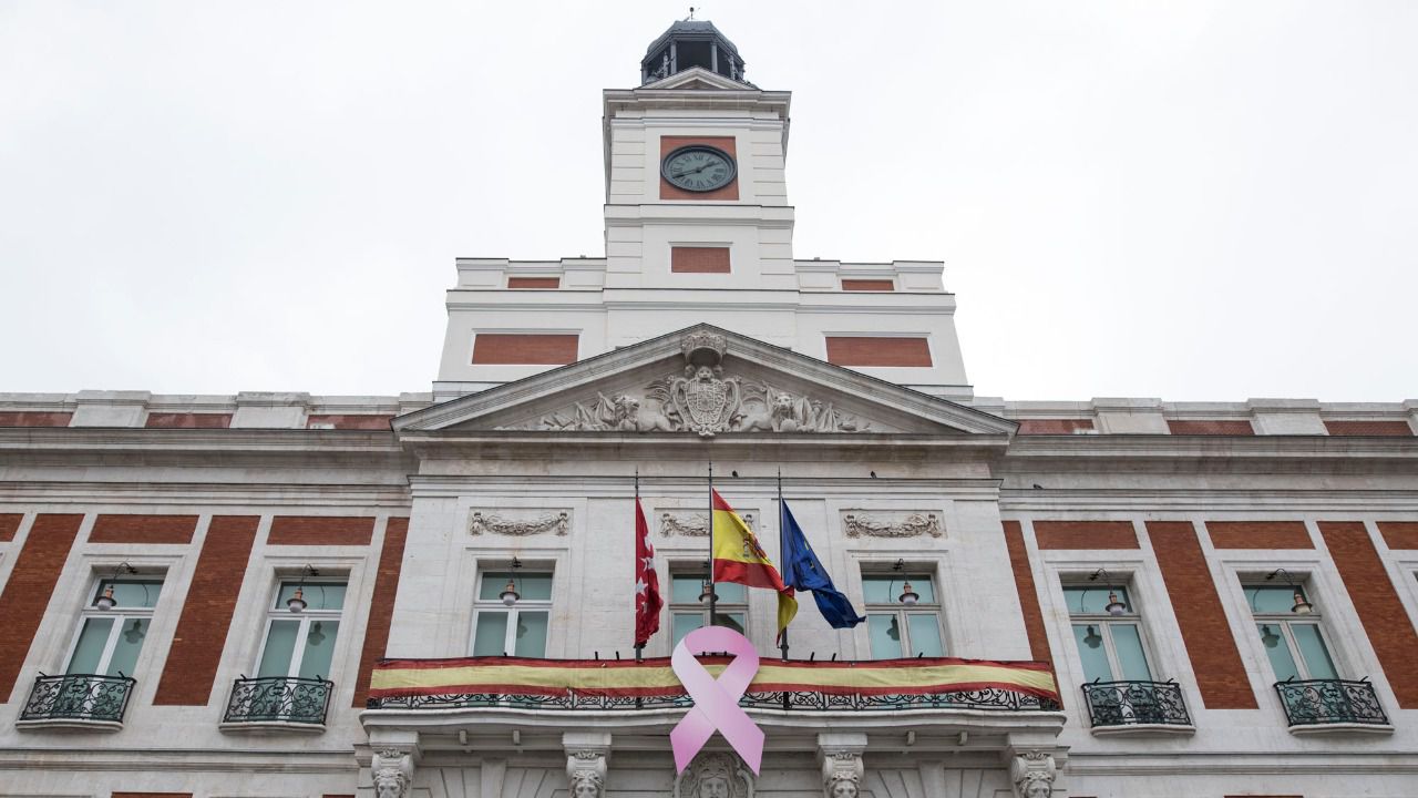 La sede de la Comunidad de Madrid, en Sol, ha puesto un lazo rosa en el balcón para conmemorar el Día Mundial del Cáncer de Mama.