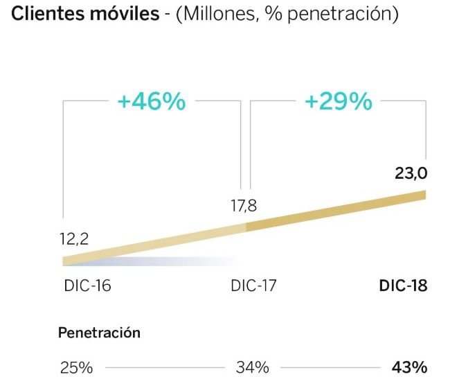 Durante 2018, BBVA ha alcanzado un hito en la digitalización de su negocio. A cierre de año, más de la mitad de sus clientes (un 51%) utilizaban canales digitales para relacionarse con el banco. Los clientes móviles han alcanzado el 43% del total y, en 2019, el objetivo es que superen también el umbral del 50%. Por otra parte, las unidades vendidas por canales digitales representan el 41% del total, frente a tan solo un 16% hace dos años.