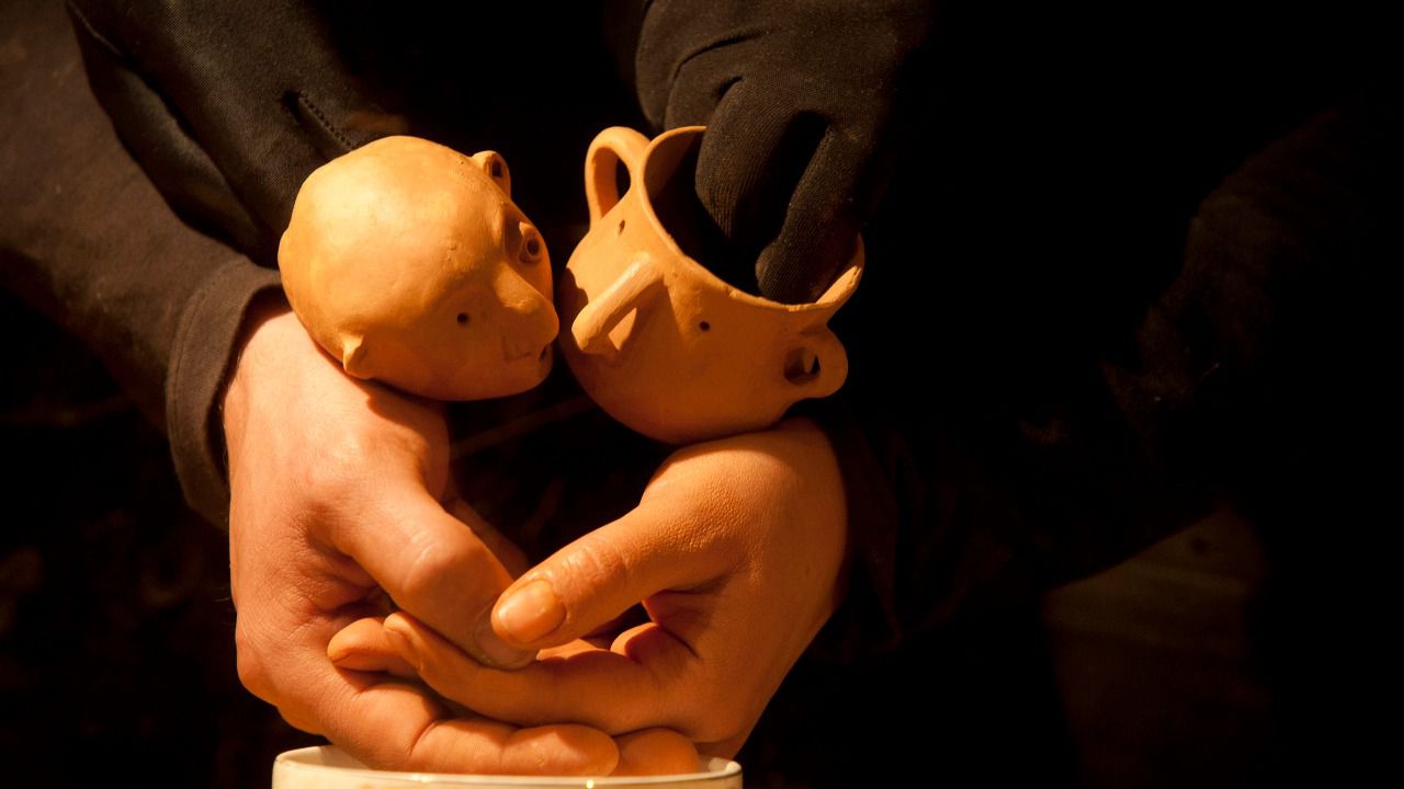 En la primera parte del montaje, los artistas juegan a modelar barro con sus propias manos para crear al que será uno de los personajes. En la segunda parte, un diminuto escenario convertido en un escaparate de una tienda de objetos enmarca la historia de un hombrecillo con la cabeza de barro y una taza. Unos protagonistas que toman vida a través de los movimientos de guantes que visten las manos de los actores: "Trabajamos sin palabras, solo con los movimientos de la mano y la cabeza del títere". La historia no necesita ser contada con voz, la dramaturgia realiza igual su papel: "Tiene un lenguaje propio. Es universal hablar de la soledad, el amor y la libertad y es fácilmente comprensible con este tipo de espectáculo".