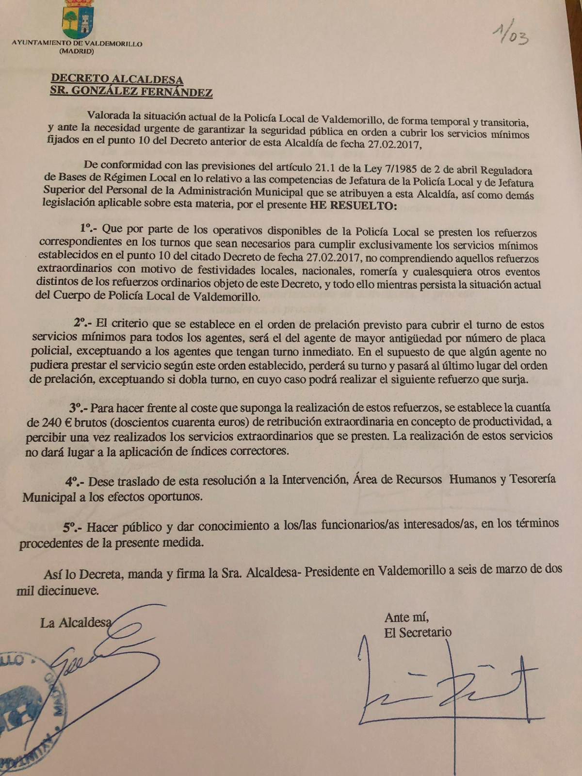 Así está reflejado en el decreto al que ha tenido acceso Madridiario y en el que se especifica que "de forma temporal y transitoria y ante la necesidad urgente de garantizar la seguridad pública", el Ayuntamiento cubrirá "los servicios mínimos" con "operativos disponibles de la Policía Local" que se presten a realizar esos "refuerzos extraordinarios".