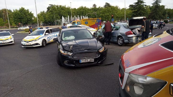 Un coche que estaba siendo perseguido desde Las Rosas ha chocado contra otros dos vehículos en las inmediaciones del Cementerio de La Almudena al irrumpir en la rotonda de la avenida Daroca. El conductor del coche a la fuga está esposado siendo atendido por el Samur.