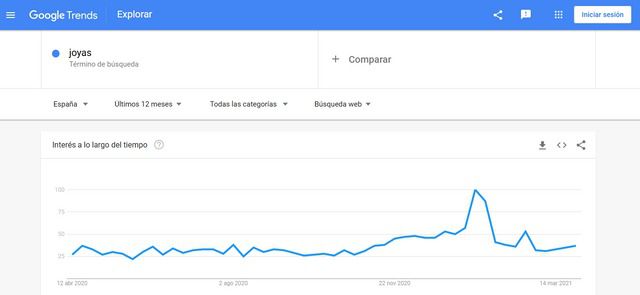 Por ejemplo, si hacemos un análisis a través de Google Trends, la herramienta con la que podemos ver qué han buscado los internautas en cualquier momento, vemos el repunte de palabras relacionadas con el sector, como "joyas".