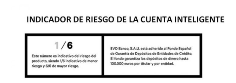 EVO BANCO, S.A. ("la entidad") NIF A70386024 I.R.A.E. del Bde nº0239. I.R.M. MADRID. T.31.840. F.88. H.M-572999. Insc. 2ª. Dom. Social: Serrano 45. 28001 Madrid. Para contratar la Cuenta Inteligente debes ser mayor de 18 años. La Cuenta Inteligente son dos cuentas conectadas: una corriente para tú día a día y otra a plazo para tus ahorros. Cuenta a plazo remunerada durante 4 meses al 0,05% TIN hasta 30.000€ y sin comisiones de ningún tipo. Liquidación mensual de intereses. En la Cuenta Inteligente, el día 15 de cada mes, el saldo de la cuenta corriente que exceda de 3.000€ pasará automáticamente a la cuenta aplazo. Sin penalización por reintegros anticipados. Renovable automáticamente cada 4 meses según remuneración vigente. Debes saber que, aunque EVO no cobre nada por retirar dinero a débito en el extranjero, algunas entidades propietarias de cajeros pueden aplicar una tasa de recargo por su utilización. Debes mantener todos los productos gratuitos que integran la Cuenta Inteligente EVO (Cuenta corriente, Cuenta a plazo, Tarjeta Inteligente, Banca a Distancia y Servicio de Alertas). Puedes disponer de un máximo de dos Tarjetas Inteligentes bonificadas. Puedes cancelar tu Cuenta Inteligente sin coste de cancelación."