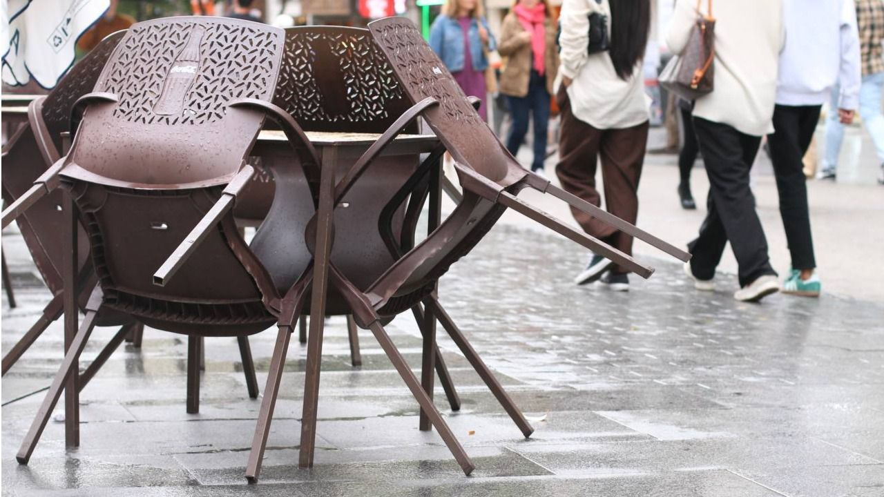Sillas de terraza recogidas por la lluvia (Foto: Claudia Díaz)