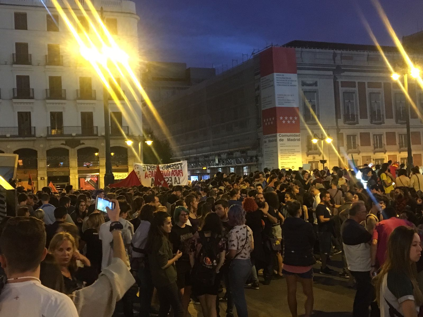 Un centenar de personas ha acudido este domingo a las 19:00 horas a la puerta del Sol para mostrar su repulsa por las cargas policiales que han tenido lugar en algunos colegios electorales de Cataluña este 1 de octubre.