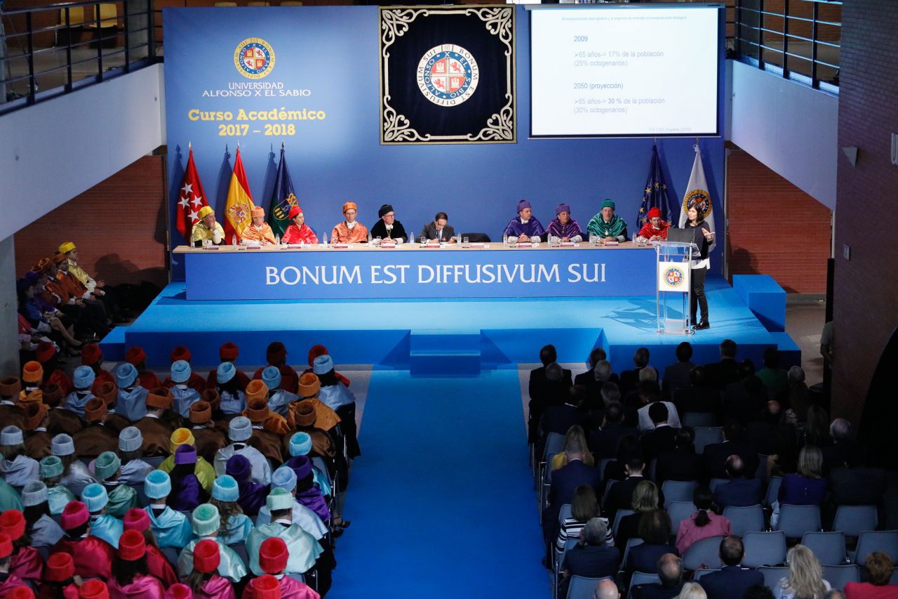 Este miércoles, 4 de octubre, ha tenido lugar el Solemne Acto de Apertura del Curso Académico 2017-2018 en la Universidad Alfonso X el Sabio. Presidido por Jesús Núñez Velázquez, presidente de la institución, y por el rector, José Domínguez de Posada, la doctora María Blasco Marhuenda, directora del Centro Nacional de Investigaciones Oncológicas (CNIO), ha sido la encargada de impartir la lección magistral, titulada “Hacia un futuro sin enfermedad”.
