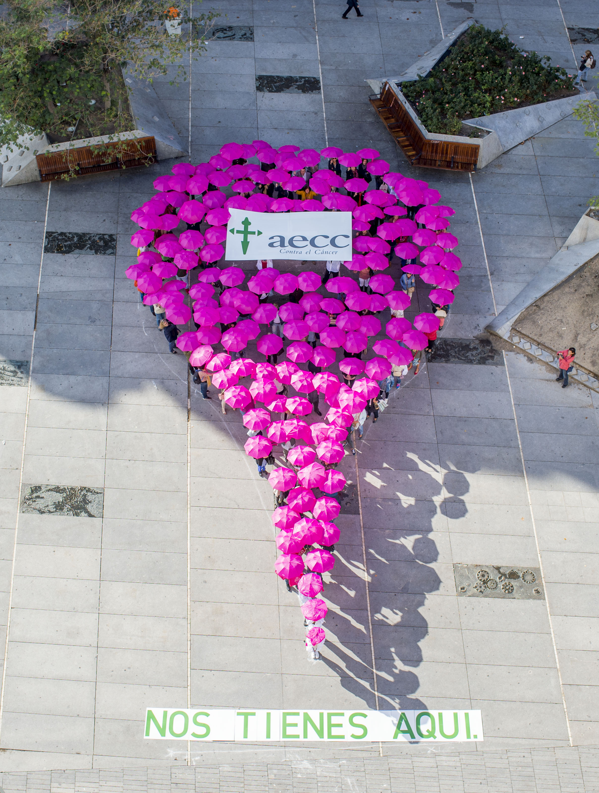 Gigantescas gotas humanas formadas a base paraguas o globos rosas se han formado este jueves en varios municipios de la región para conmemorar el Día Internacional Contra el Cáncer de Mama, que afect a 1 de cada 8 mujeres en España.
