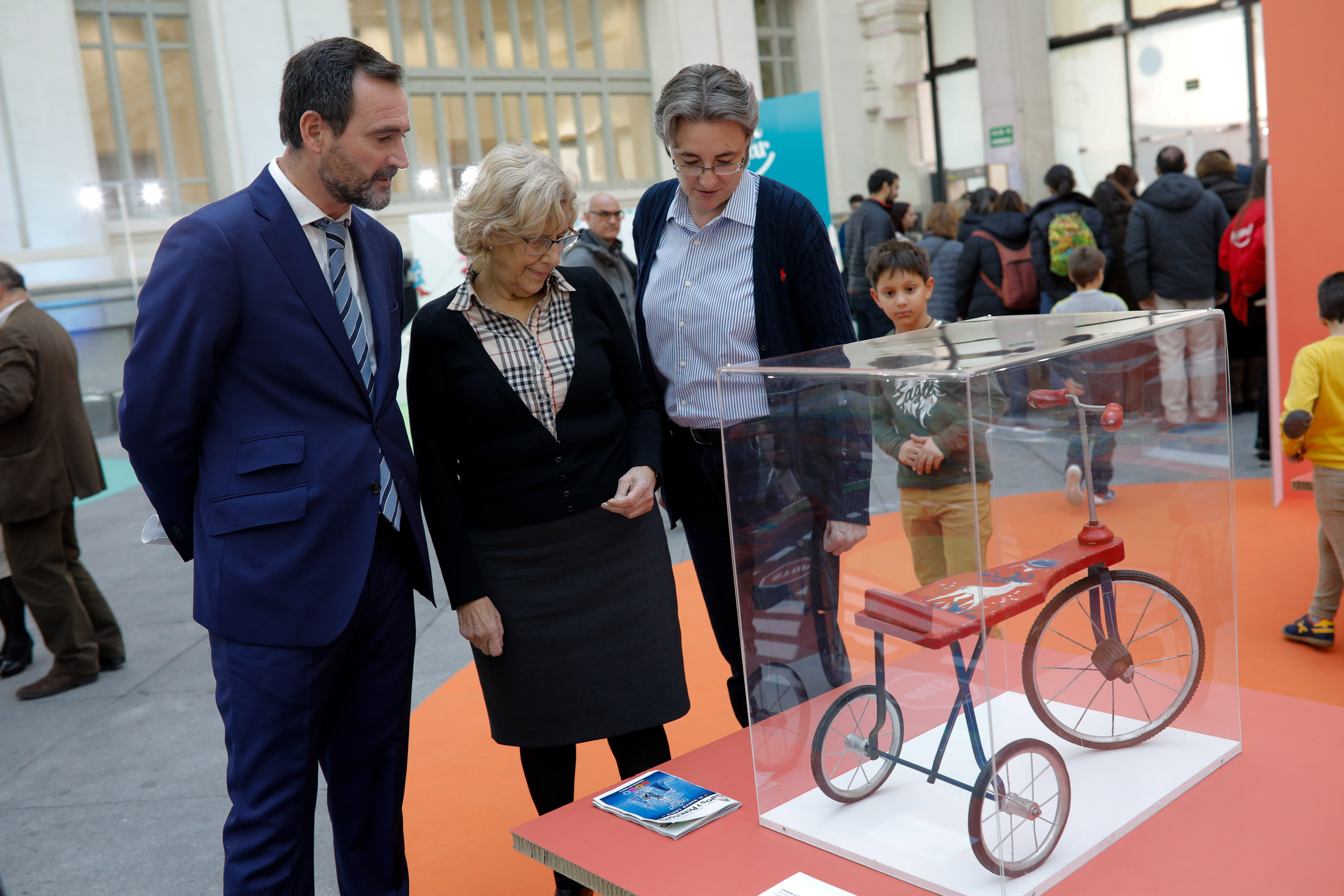 La alcaldesa de Madrid, Manuela Carmena, y el presidente de la Asociación Española de Fabricantes de Juguetes, José Antonio Pastor, han abierto esta mañana la muestra Me Gusta Jugar en la Galería de Cristal del palacio de Cibeles.