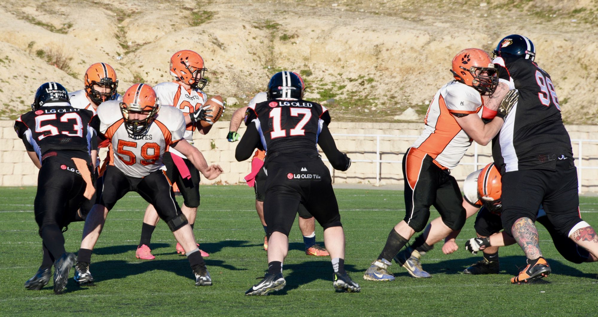 Este sábado se ha celebrado los partidos correspondientes a la cuarta jornada de la LNFA Serie A. Los equipos madrileños cumplieron con lo que ha priori eran unos encuentros cómodos para ellos. Osos Rivas se enfrentaba a los gallegos Santiago Black Ravens (46-0), un partido marcado por las diferencias entre los dos equipos, que evidencio que los gallegos recién llegados a la Liga Nacional necesitan mucho más rodaje, aunque demostraron gran coraje y cierta soltura en su juego, no pudieron marcar. Los Osos con un gran play-book de jugadas y sobre todo con una poderosa carrera, enfrentaron un partido de transición que les permite afianzarse en la clasificación para el paso a los cuartos, dando minutos a jugadores más novatos en previsión de los partidos que les restan, destacando en la dirección del equipo Sergio Barbero que demostró que puede ser un QB de futuro.