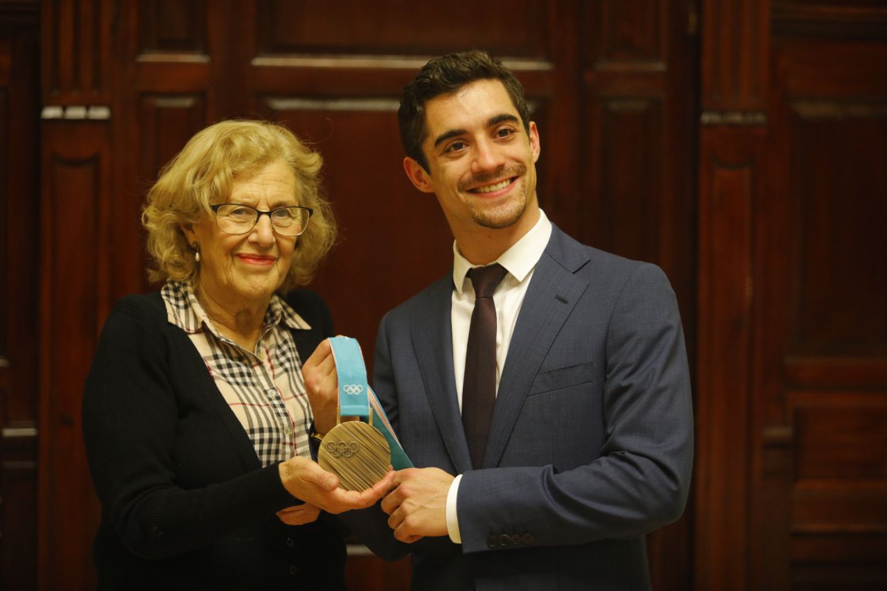 La alcaldesa Manuela Carmena ha recibido en Cibeles al patinador y medallista olímpico Javier Fernández tras regresar con un bronce de los Juegos Olímpicos de PyeongChang (Corea del Sur).