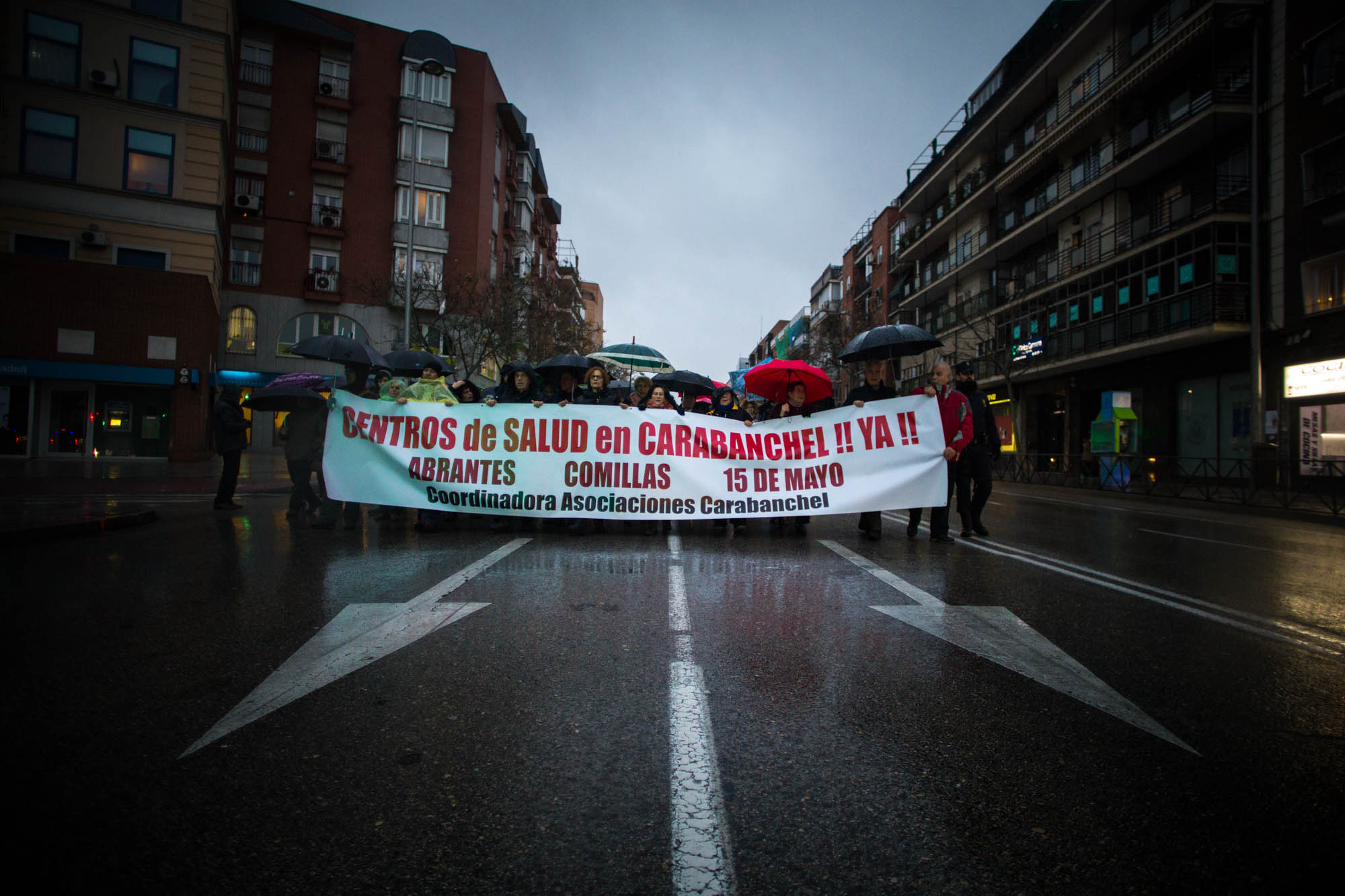 Un centenar de vecinos de Carabanchel se han manifestado este miércoles para exigir a la Comunidad de Madrid la construcción de los tres centros de salud a los que se comprometieron hace 15 años. Con el lema "Defiende tu derecho a un centro de salud digno" y bajo una intensa lluvia que ha cancelado la marcha a la mitad, los vecinos han clamado por el incumplimiento del Plan Especial de Inversiones para Carabanchel que firmaron la Coordinadora de Asociaciones de Carabanchel y el Ayuntamiento que incluía el acuerdo de cesión a la Comunidad de Madrid de tres parcelas para construir otros tantos centros de salud.