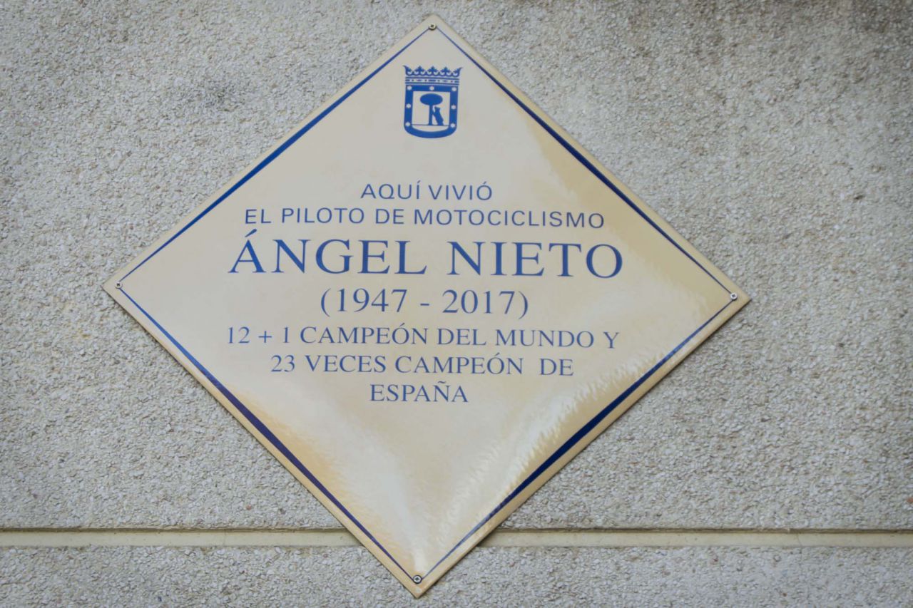 En homenaje al piloto fallecido Ángel Nieto, este jueves se ha descubierto una placa situada en su casa de Vallecas donde vivió durante gran parte de su vida. Al acto, además del concejal-presidente de Vallecas, Paco Pérez, han acudido varios familiares de Nieto como su hijo 'Gelete', su sobrino Fonsi Nieto, sus hermanos y su primera mujer.