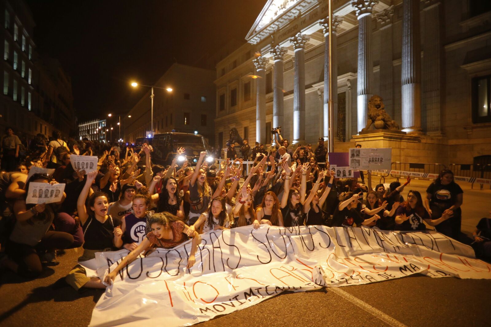 Colectivos feministas se han concentrado este jueves 26 de abril frente al ministerio de Justicia en Madrid convocados por el Movimiento Feminista de Madrid para protestar contra la sentencia "injusta" e "insuficiente" de la Audiencia de Navarra por el caso de 'La Manada'.