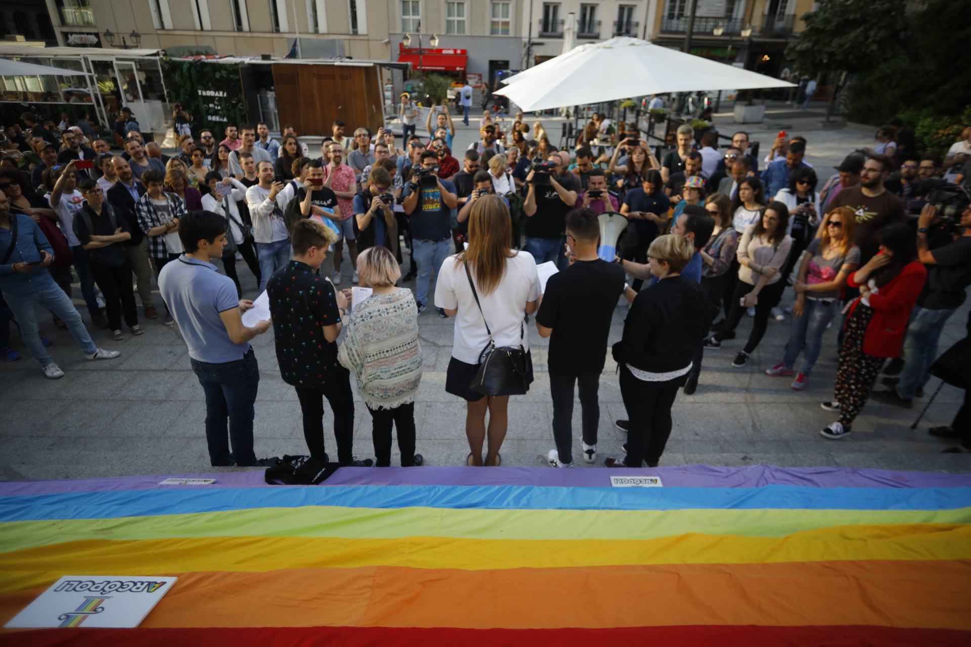 La asociación Arcópoli ha realizado una concentración en la plaza de Pedro Zerolo en el Día Internacional contra la homofobia.