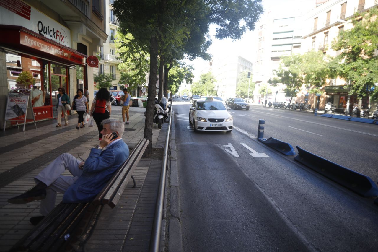 Desperfectos y socavones en el carril bus taxi de la calle Alcalá, entre Manuel Becerra y Goya.