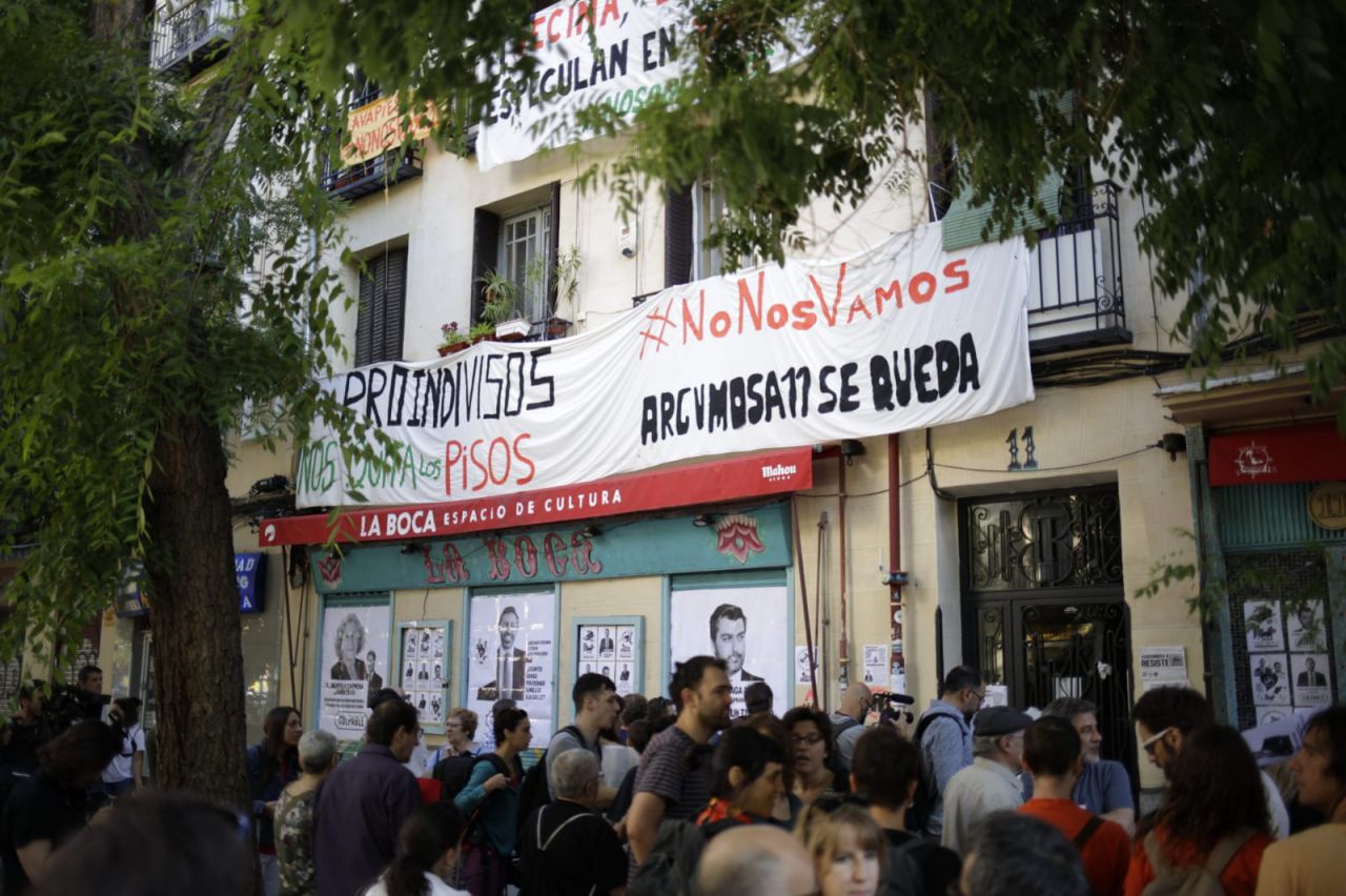 Distintos colectivos han acompañado este jueves a la familia afectada por la compra del edificio de Argumosa, en Lavapiés. Pancartas y mensajes para frenar el desalojo que también afecta a otros inquilinos.