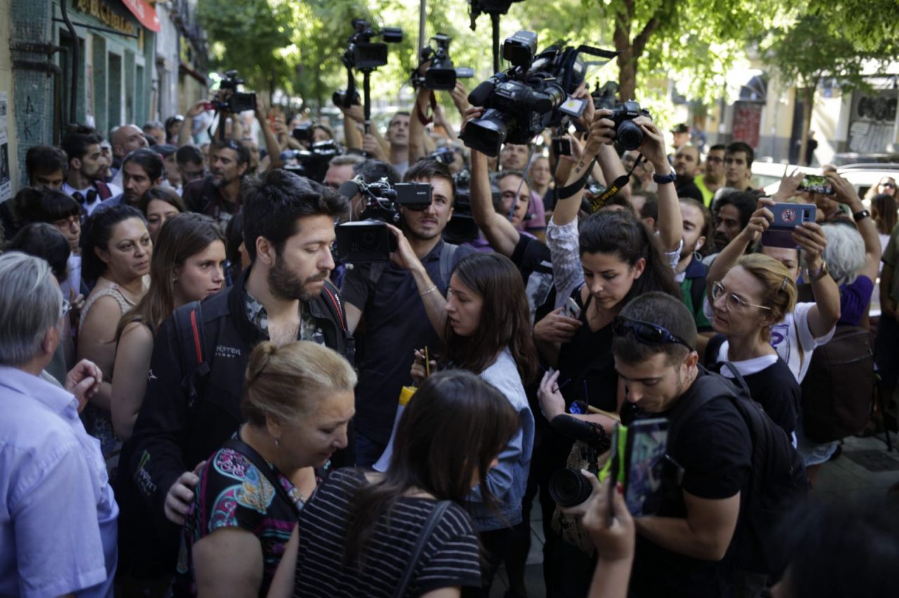Distintos colectivos han acompañado este jueves a la familia afectada por la compra del edificio de Argumosa, en Lavapiés. Pancartas y mensajes para frenar el desalojo que también afecta a otros inquilinos.