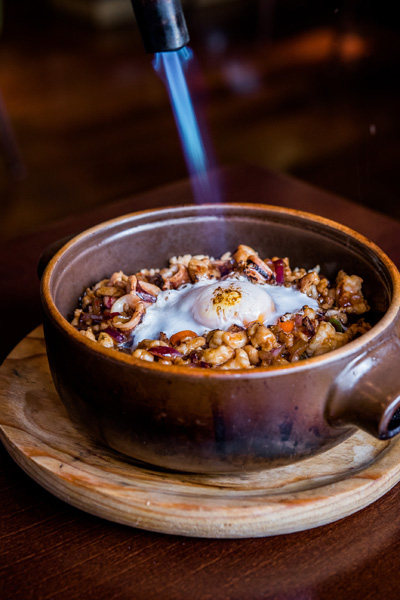 Ku Bak crujiente acompañado de pollo y mariscos con huevo de pita pinta