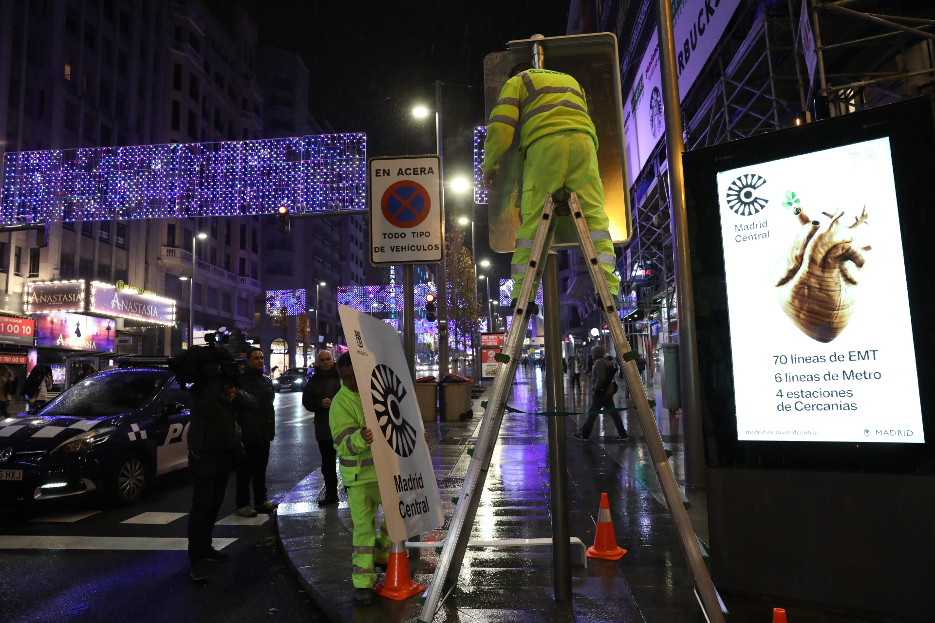 Los operarios del Ayuntamiento de Madrid ultimaban los detalles de las señales de Madrid Central antes de su puesta en marcha.