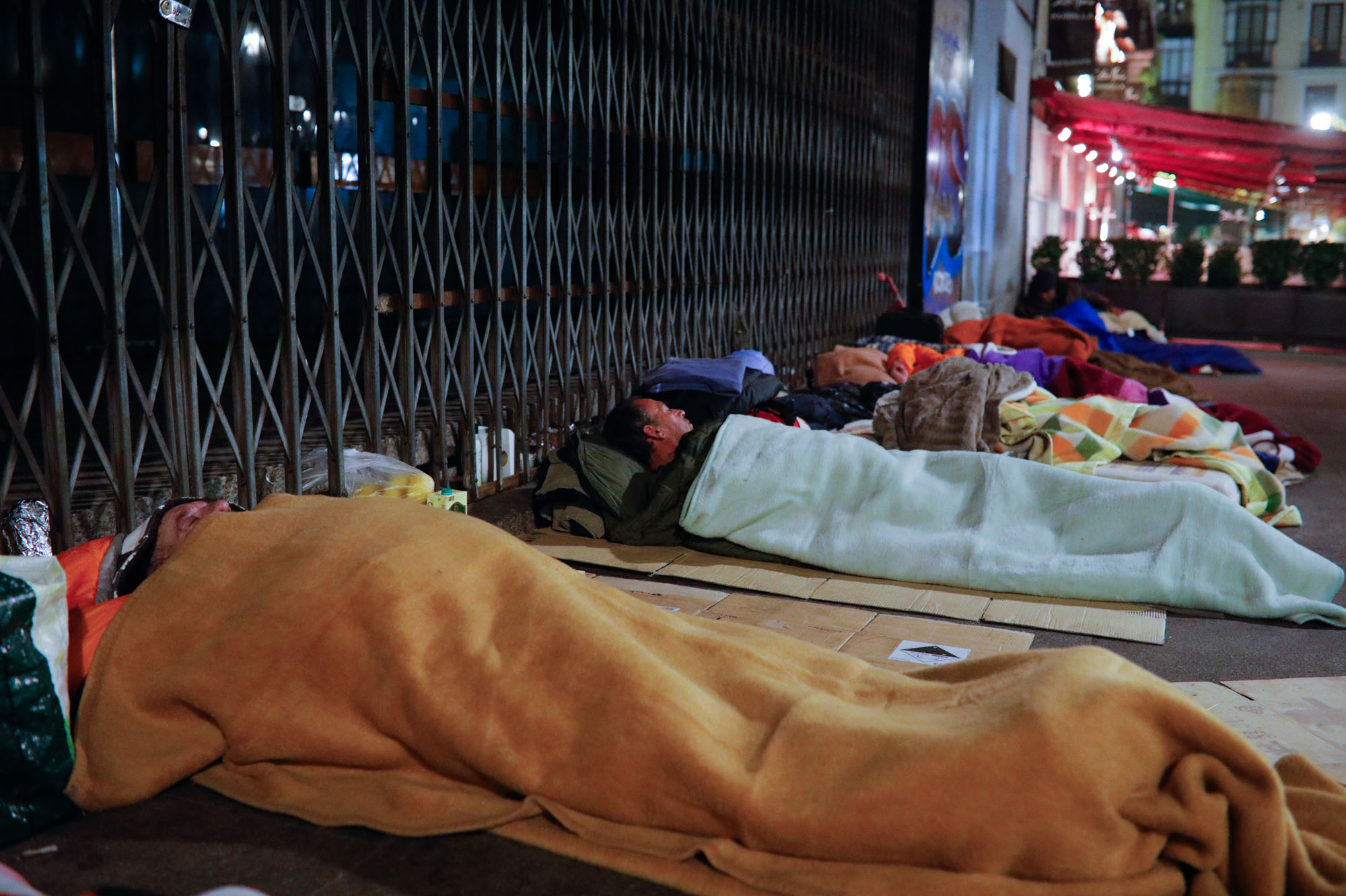 Más de veinte personas duermen a las puertas del teatro cine Real Cinema en la plaza de Isabel II, frente al Teatro Real.