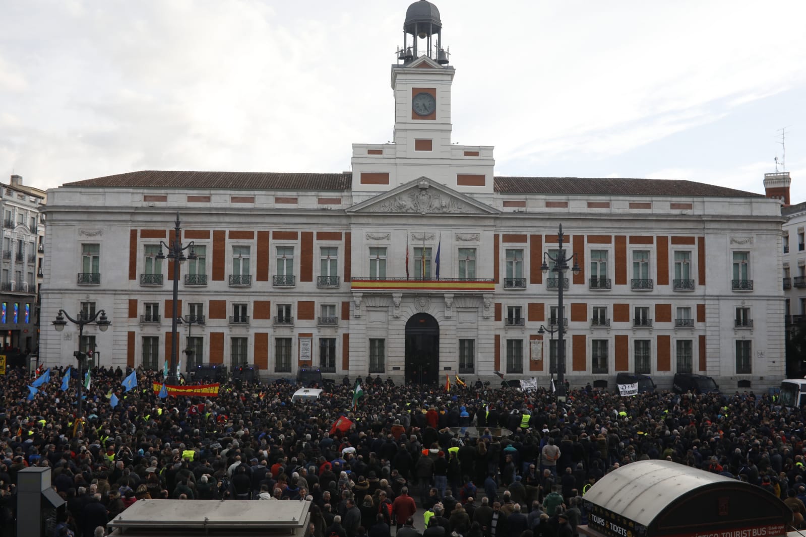 La mañana ha comenzado con el desalojo de los taxistas del Paseo de la Castellana, donde han acampado este fin de semana. La manifestación se ha trasladado entonces a la calle Génova, frente a la sede del PP, donde han permanecido hasta primera hora de la tarde, cuando han tomado la Puerta del Sol. En un último cambio de ubicación, se han congregado en las inmediaciones del Wizink Center, donde Isabel Díaz Ayuso y José Luis Martínez-Almeida acudían a un acto sobre el Holocausto. (5306 visitas)
