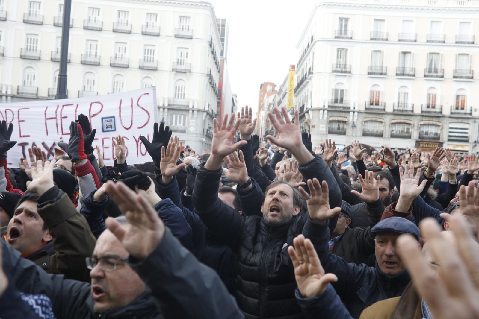La mañana ha comenzado con el desalojo de los taxistas del Paseo de la Castellana, donde han acampado este fin de semana. La manifestación se ha trasladado entonces a la calle Génova, frente a la sede del PP, donde han permanecido hasta primera hora de la tarde, cuando han tomado la Puerta del Sol. En un último cambio de ubicación, se han congregado en las inmediaciones del Wizink Center, donde Isabel Díaz Ayuso y José Luis Martínez-Almeida acudían a un acto sobre el Holocausto.