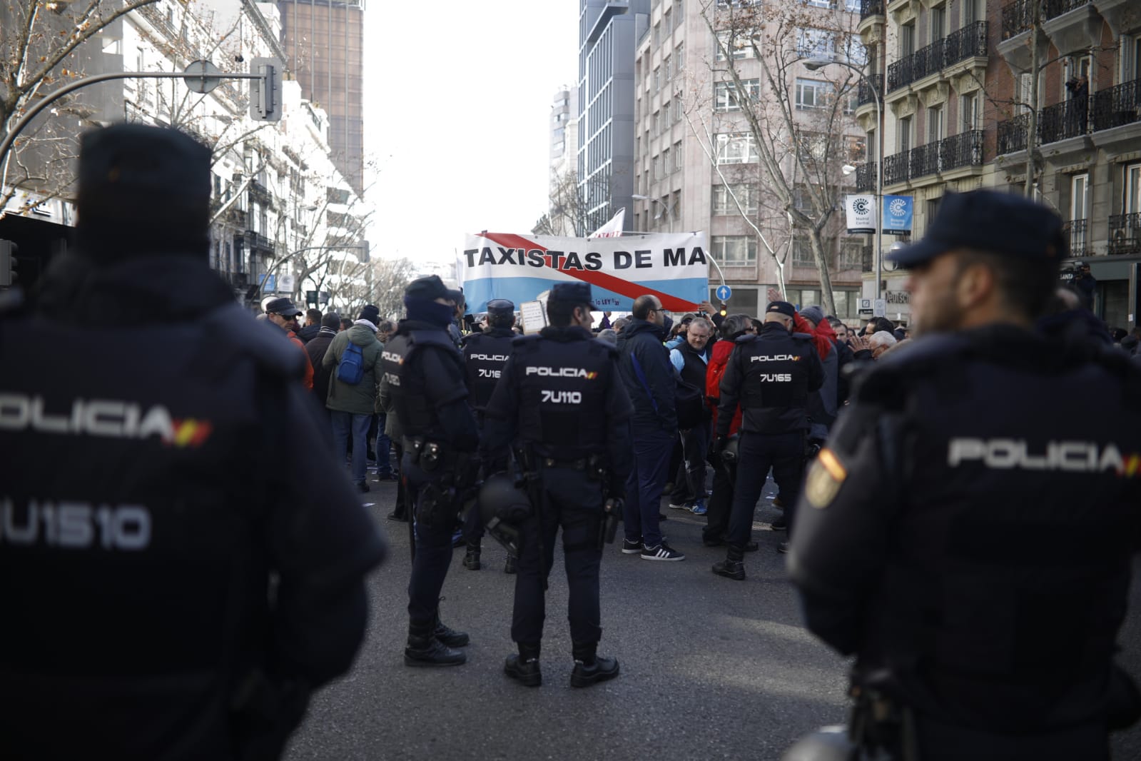 Los taxistas continúan en huelga. Y ya van diez días. Este miércoles, la protesta se ha vuelto a concentrar, como en las últimas dos jornadas, frente a la sede del PP en la céntrica calle Génova y en la Puerta del Sol. Como novedad, un centenar de manifestantes ha protestado en la calle Maudes, donde se ubica la Consejería madrileña de Transportes.