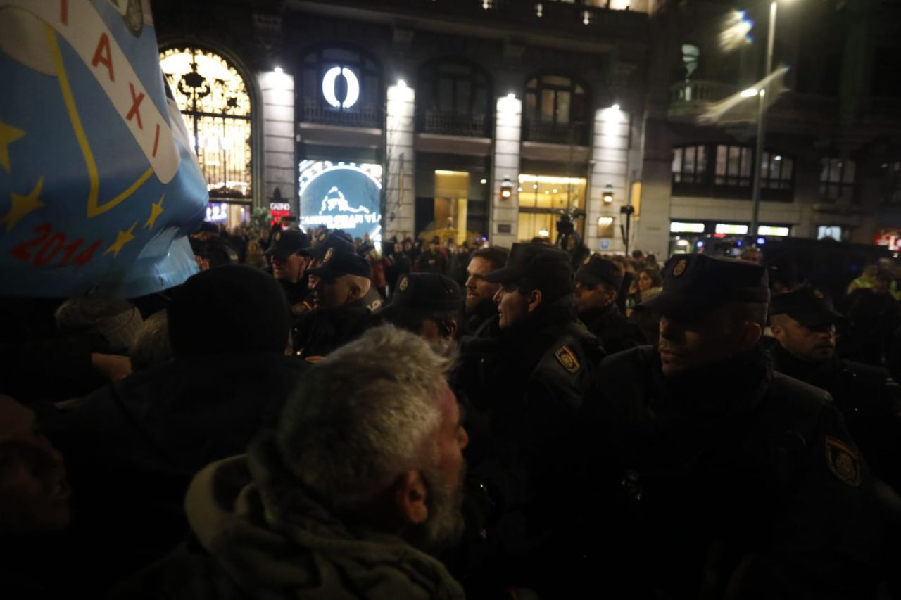 Los taxistas cortan la Gran Vía en una concentración tensa con la Policía.