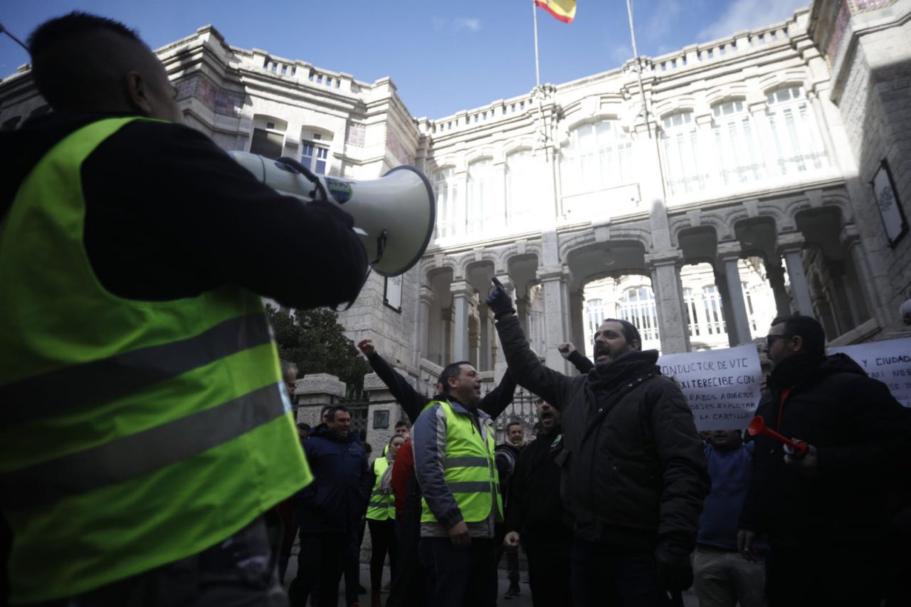 Los taxistas continúan en huelga. Y ya van diez días. Este miércoles, la protesta se ha vuelto a concentrar, como en las últimas dos jornadas, frente a la sede del PP en la céntrica calle Génova y en la Puerta del Sol. Como novedad, un centenar de manifestantes ha protestado en la calle Maudes, donde se ubica la Consejería madrileña de Transportes.