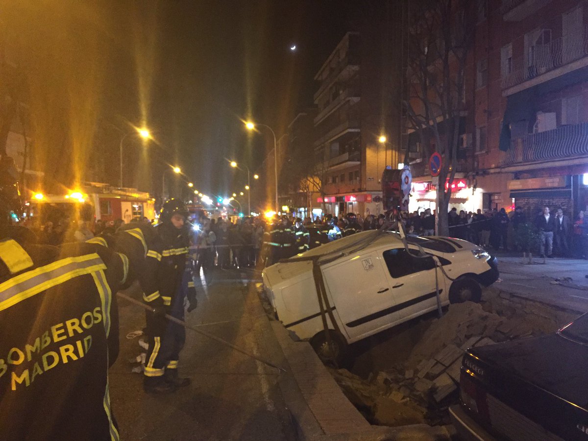 Los Bomberos sacan los dos turismos atrapados en el socavón de Ciudad Lineal con la ayuda de una grúa.