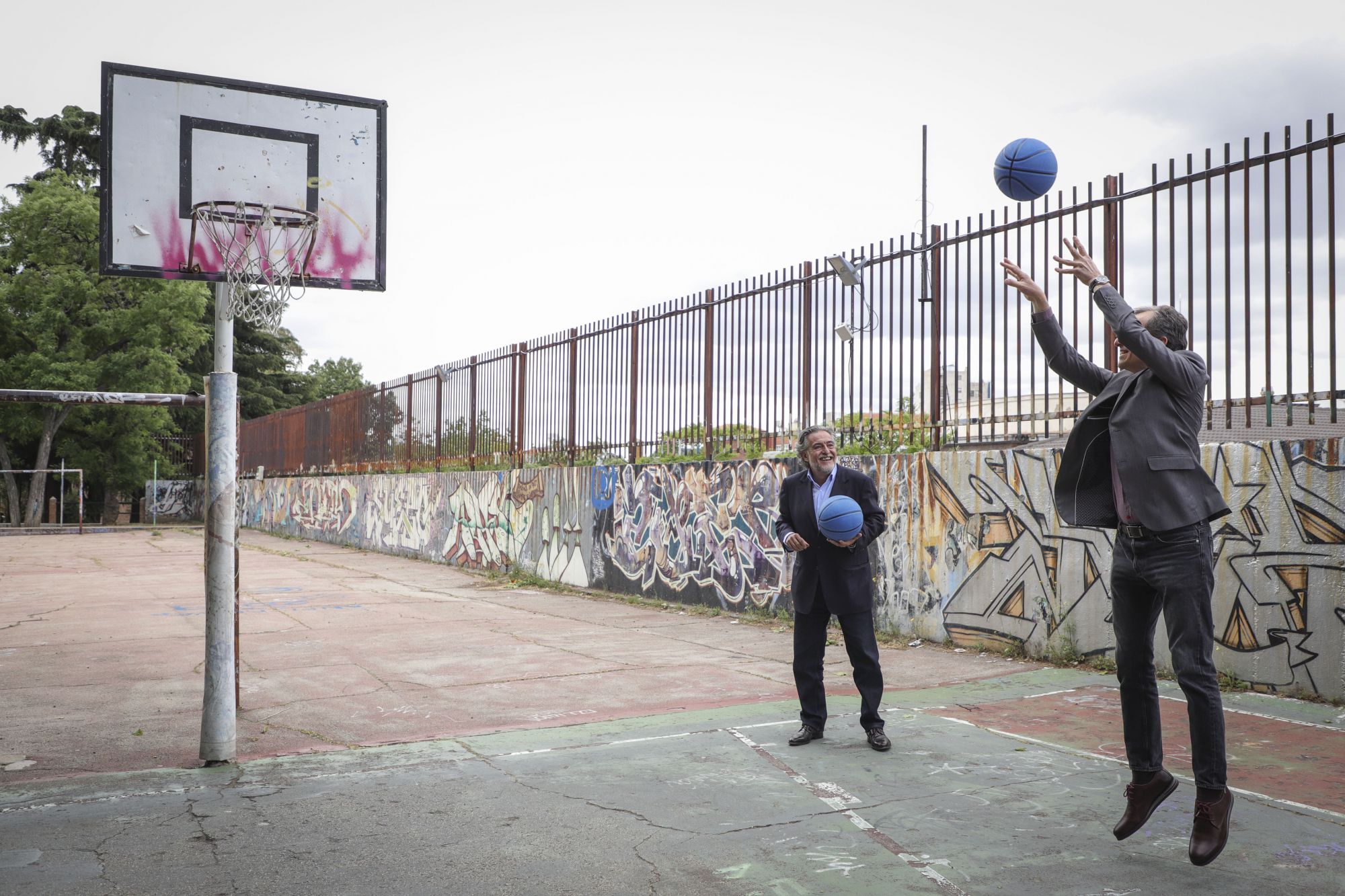 Pepu Hernández, candidato del PSOE al Ayuntamiento de Madrid junto al Ministro de Ciencia, Innovación y Universidades, Pedro Duque, juegan al baloncesto en un polideportivo municipal de Madrid