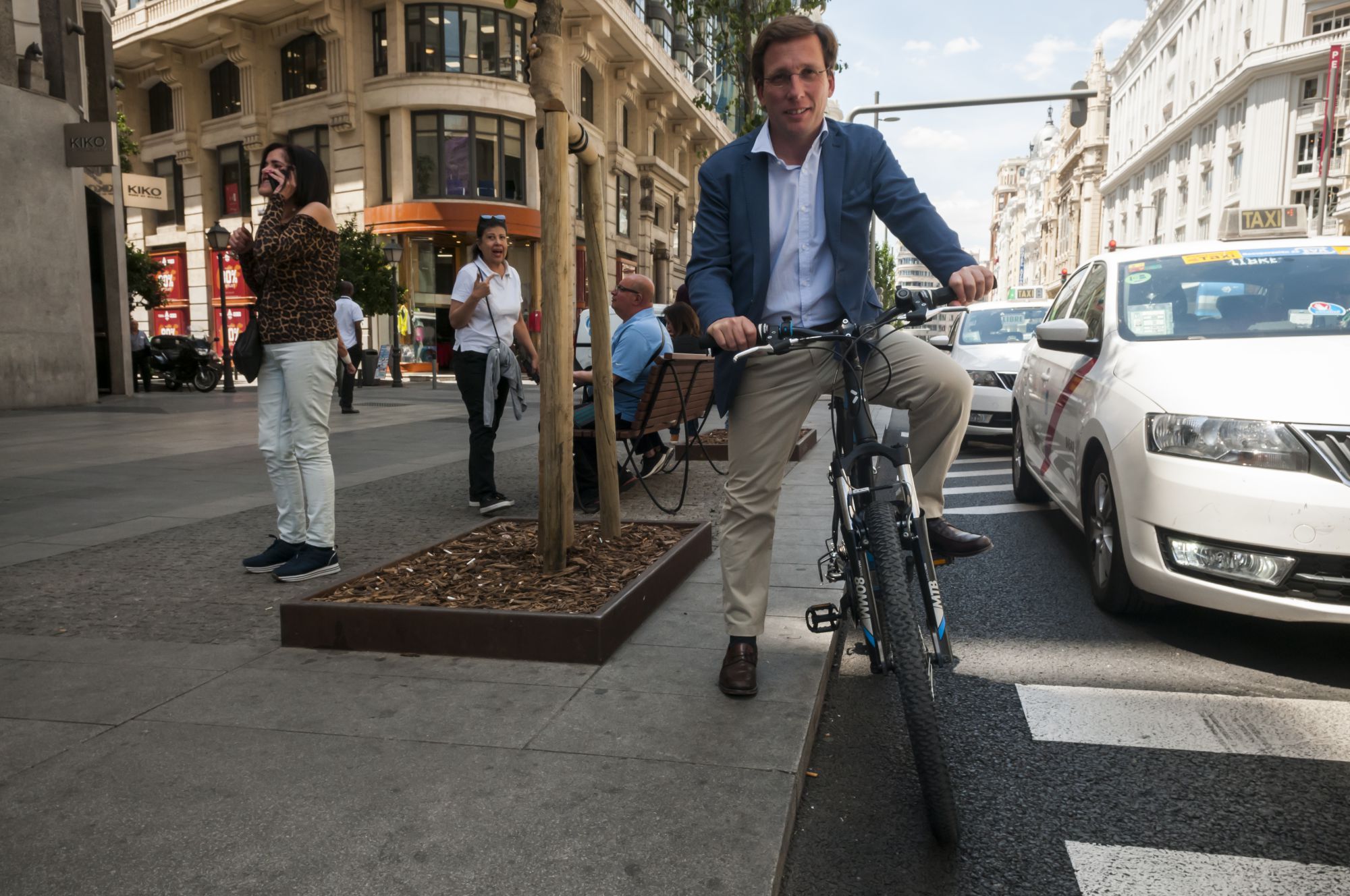 José Luis Martínez Almeida subido a una bici municipal de Madrid en plena Gran Vía tras una entrevista en Madridiario