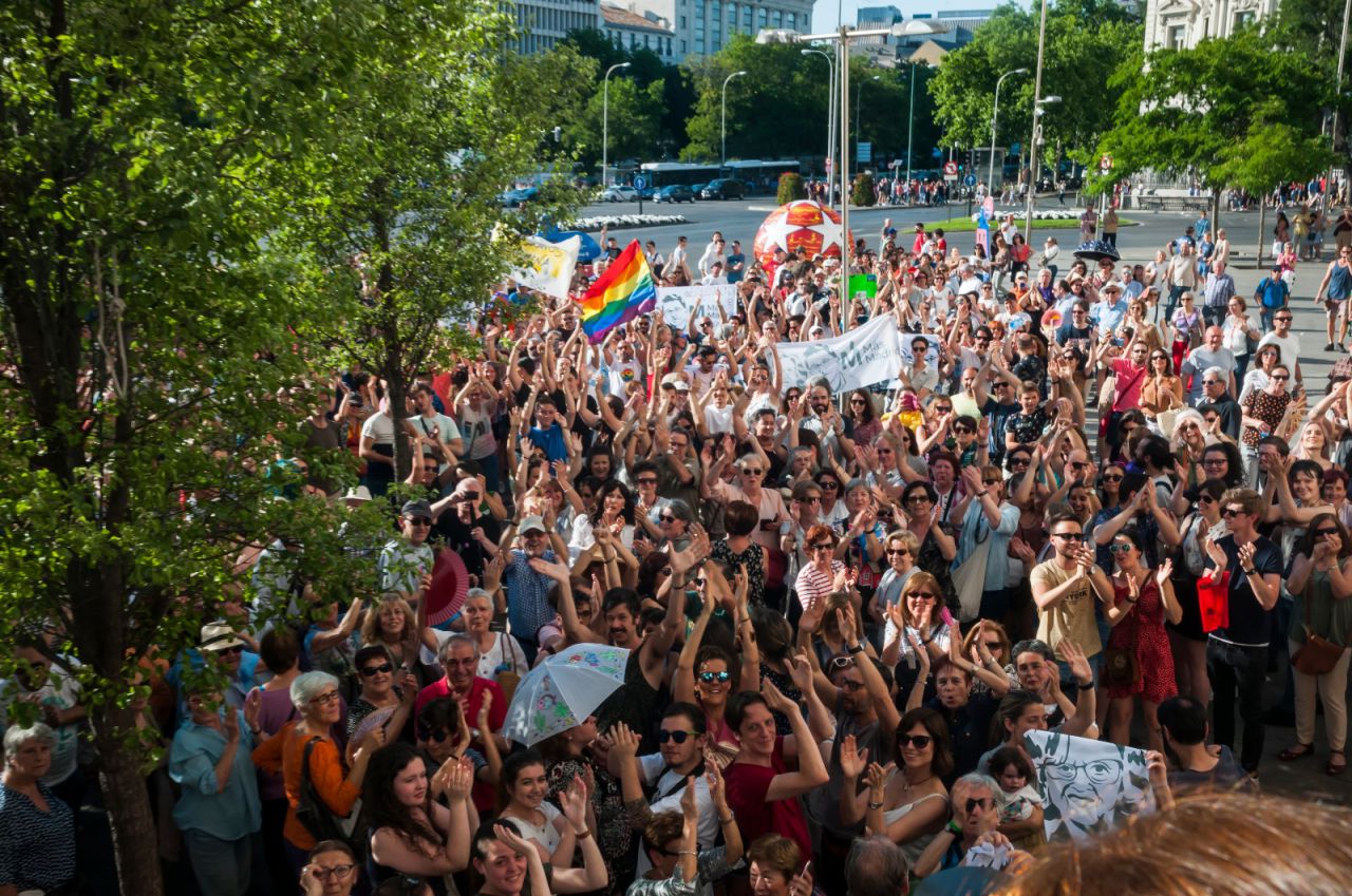 Este sábado a las 19:00, varios centenares de personas se agolparon a las puertas del Palacio de Cibeles para pedir que Manuela Carmena, actual alcaldesa en funciones, siga siéndolo cuatro años más.