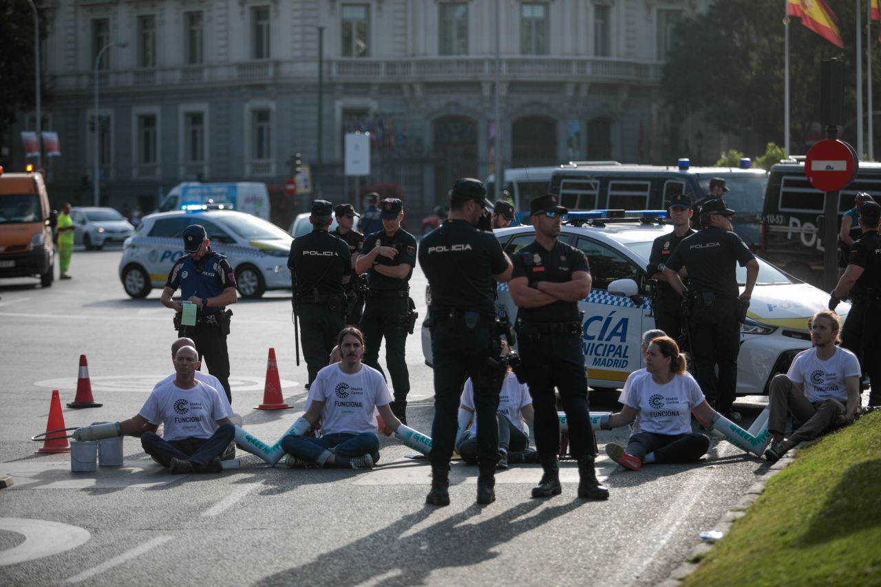 En el primer día sin multas para los infractores que entren en Madrid Central, activistas de Greenpeace bloquean desde primera hora de la mañana el acceso a Madrid Central desde la calle Alcalá. Con esta protesta matutina, la ONG reclama al Ayuntamiento que no rebaje una medida que ha demostrado su eficacia reduciendo la contaminación a su valor más bajo en 10 años.