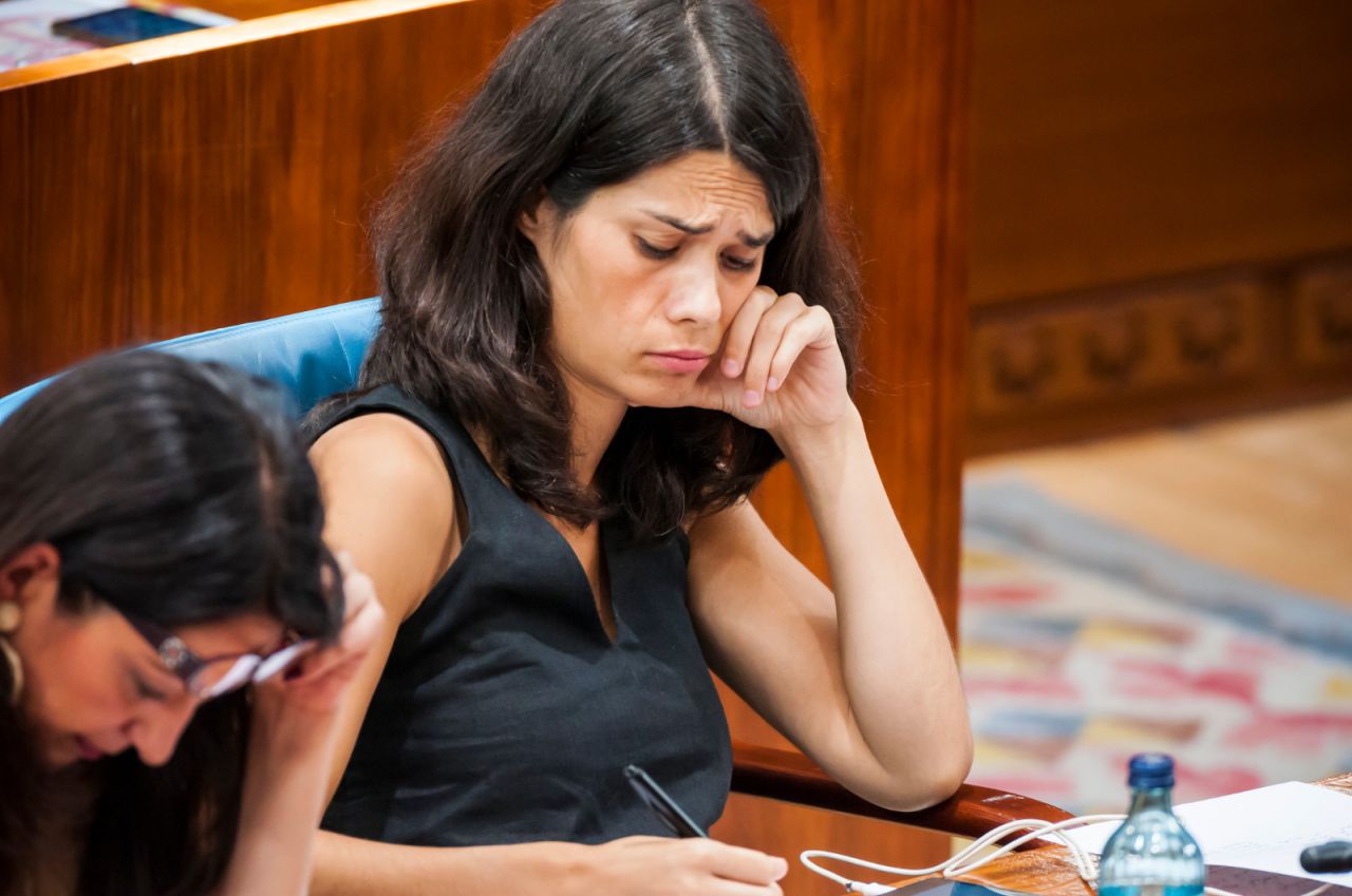 Isa Serra (Unidas Podemos), con cara de circunstancias en un instante del discurso.
