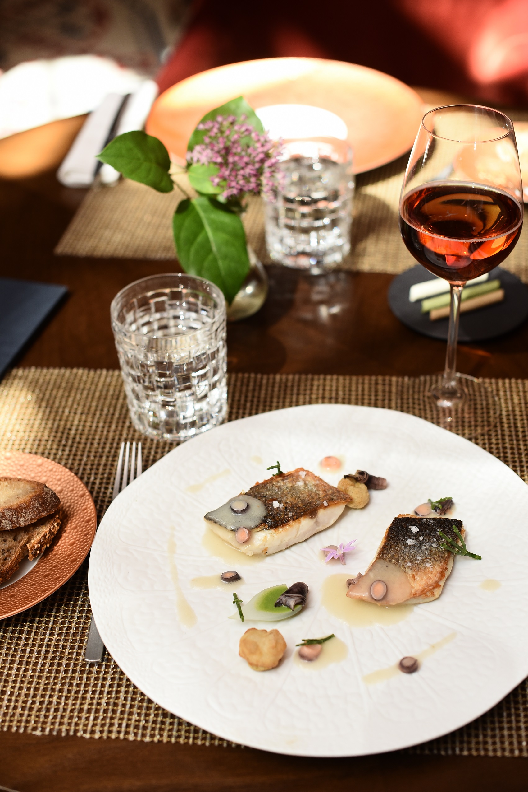 Taco de lubina reposado en marinera de percebes, crujiente de yema trufada y extracto de trigueros.